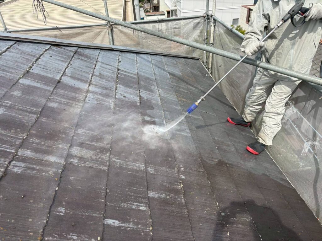 本日は、塗装前の高圧洗浄作業を行います。